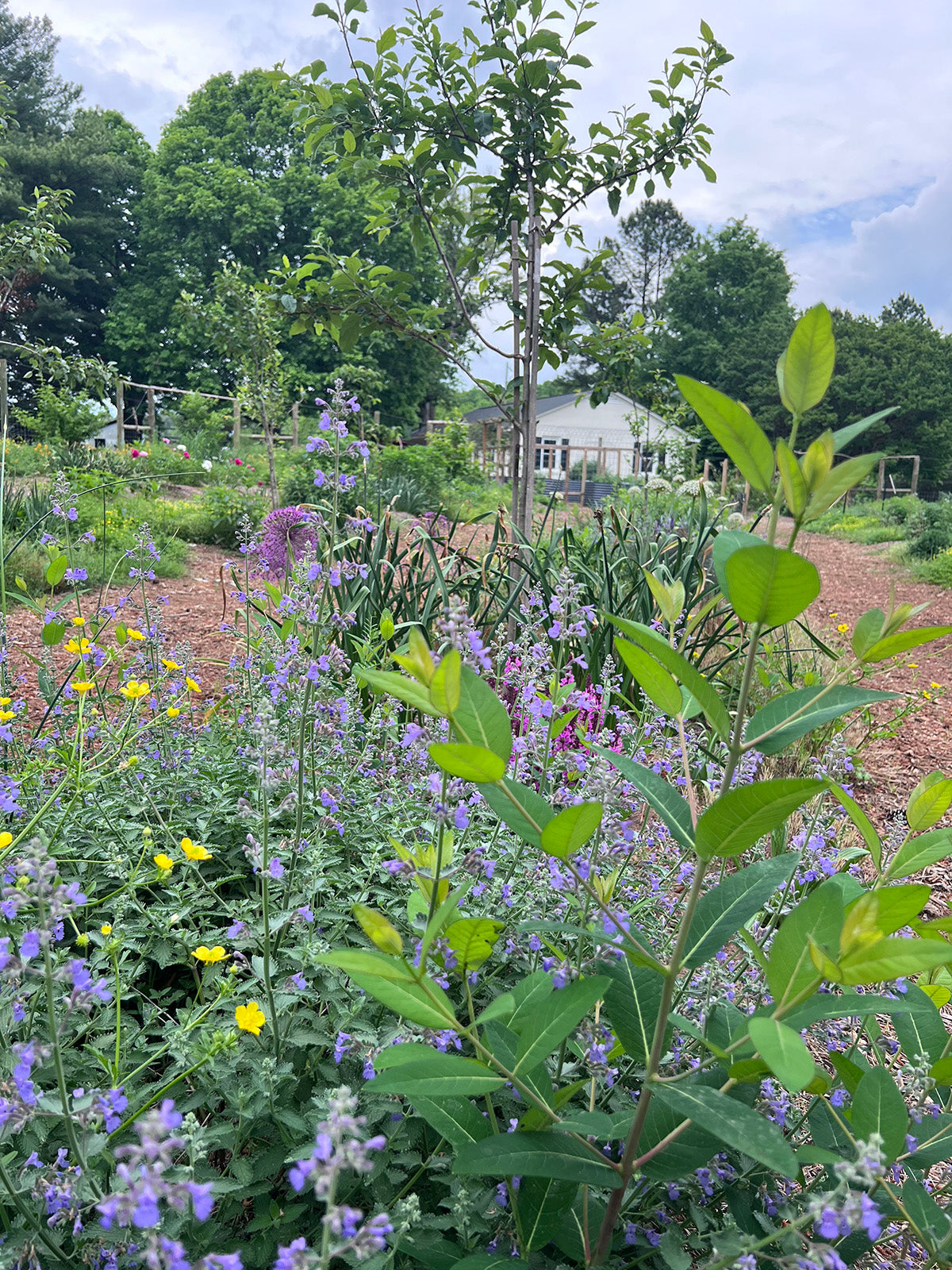 We utilize permaculture techniques that mimic the natural ecosystem. By interplanting a variety of trees, shrubs, vines, and herbs, we’re creating a self-sustaining, layered growing space that mimics a natural forest ecosystem.